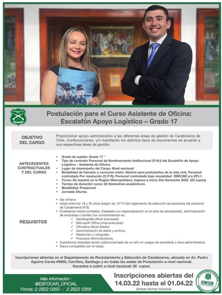 Carabineros inició la postulación para el curso de asistente de oficina, que busca contratar personal para proporcionar apoyo administrativo a las diferentes áreas de gestión de la institución confeccionando o tramitando documentación de acuerdo a sus respectivas áreas de gestión.