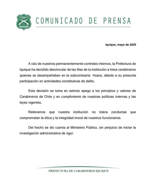 A través de un comunicado oficial, Carabineros informó que los 13 uniformados implicados fueron desvinculados debido a la participación en “actividades constitutivas de delito”.