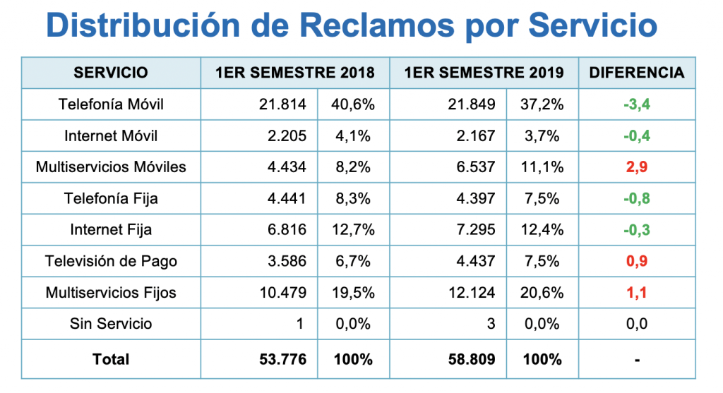 De acuerdo con el reporte, los multiservicios móviles tuvieron el mayor incremento en la cantidad de los reclamos ingresados (2,9% de alza). Le siguen los multiservicios fijos (1,1% de crecimiento) y la televisión de pago (0,9%).