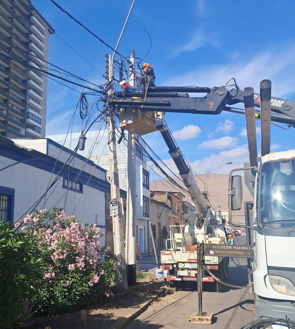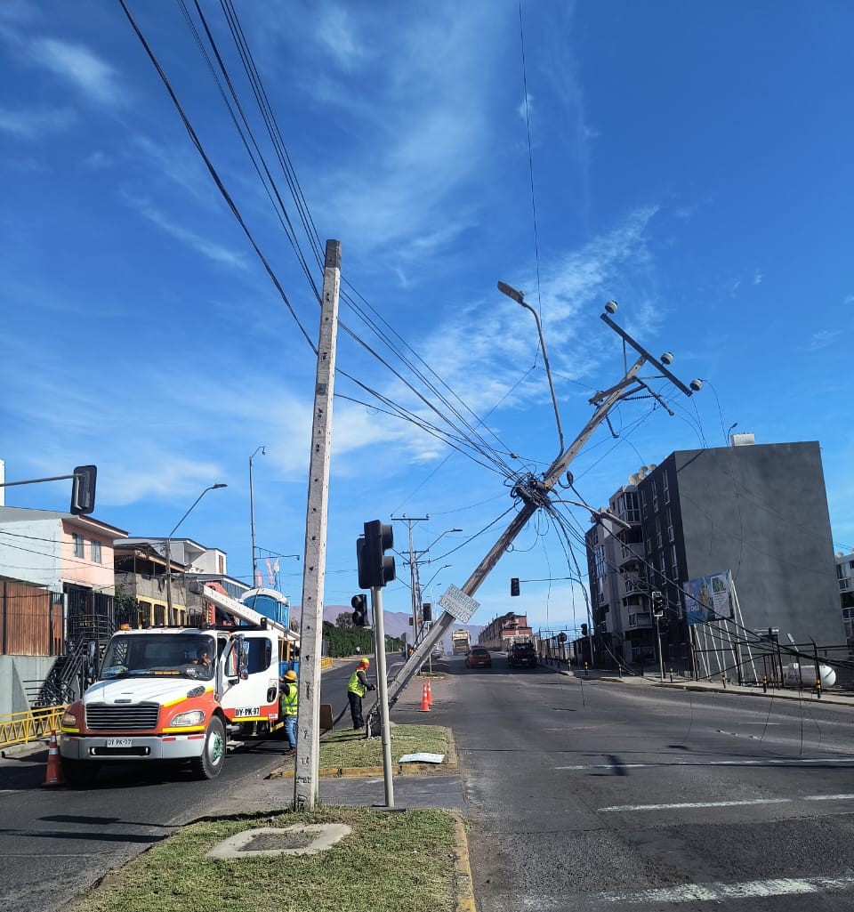 CGE informa que continúan los trabajos de reconstrucción de la red eléctrica en el sector de las calles José Joaquín Pérez con Obispo Labbé, en la comuna de Iquique, luego de un accidente de tránsito que provocó la caída de cuatro postes y daños en líneas y equipos eléctricos.