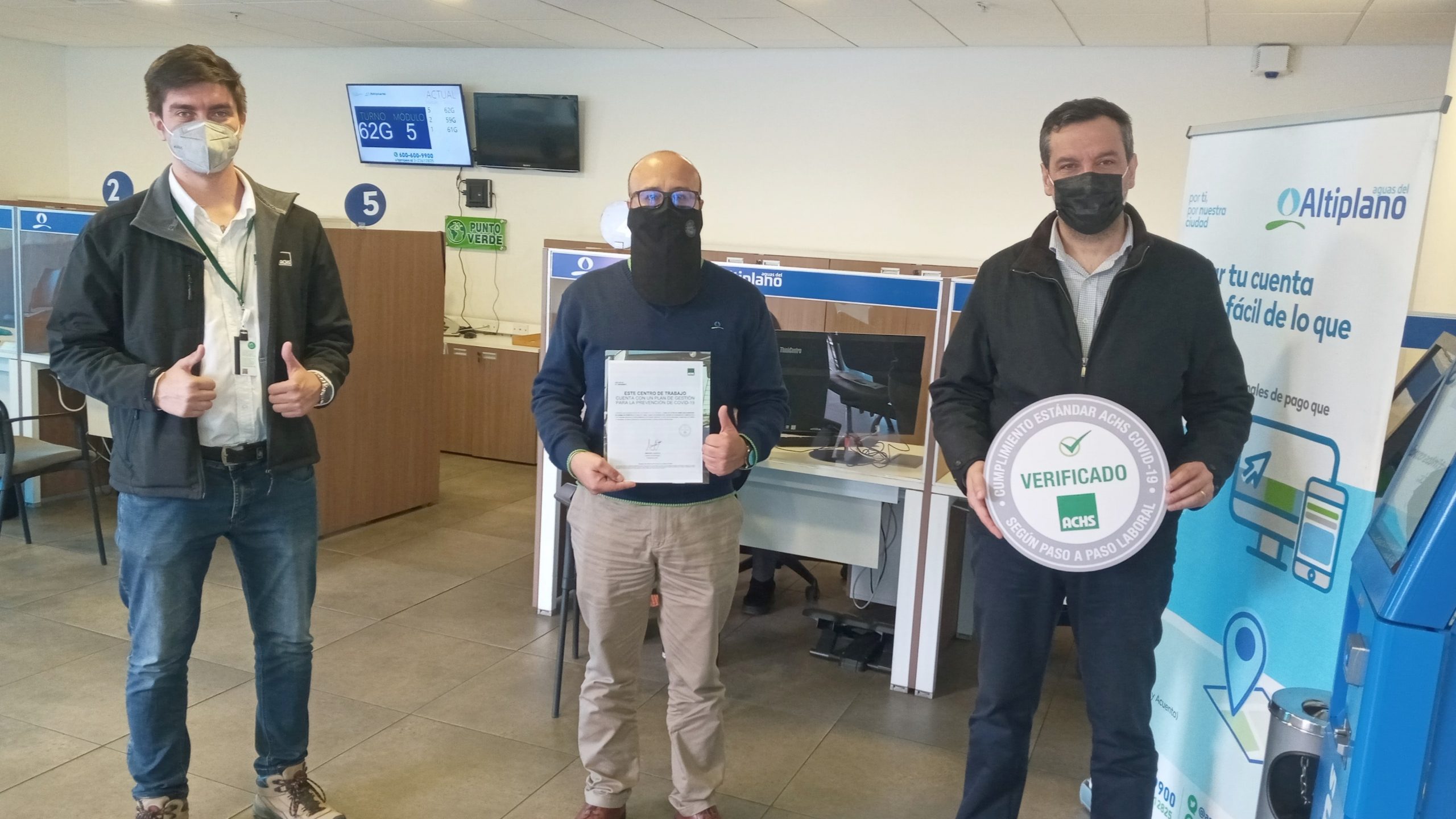 Luego de cumplir con todos los protocolos dispuestos por la Autoridad Sanitaria y de un riguroso proceso de certificación de la Asociación Chilena de Seguridad, liderado por el área de Prevención de Riesgos de la sanitaria, Aguas del Altiplano recibió el Sello Covid-19 ACHS para su Centro de Atención de Clientes en la ciudad de Iquique.