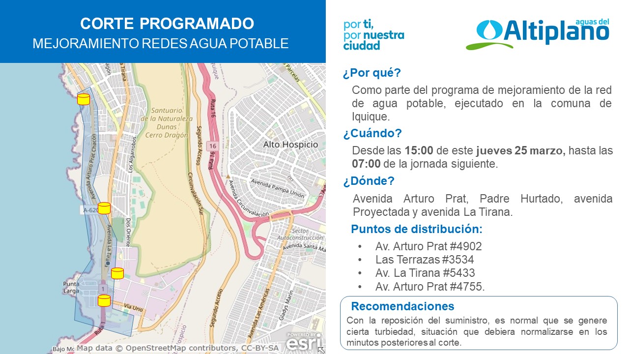 Por lo anterior, se han dispuesto cuatro puntos de distribución de agua alternativos, los cuales estarán ubicados en avenida Arturo Prat, frente al número 4902; Las Terrazas frente al número 3534; avenida La Tirana frente al número 5433 y en avenida Arturo Prat frente al número 4755.