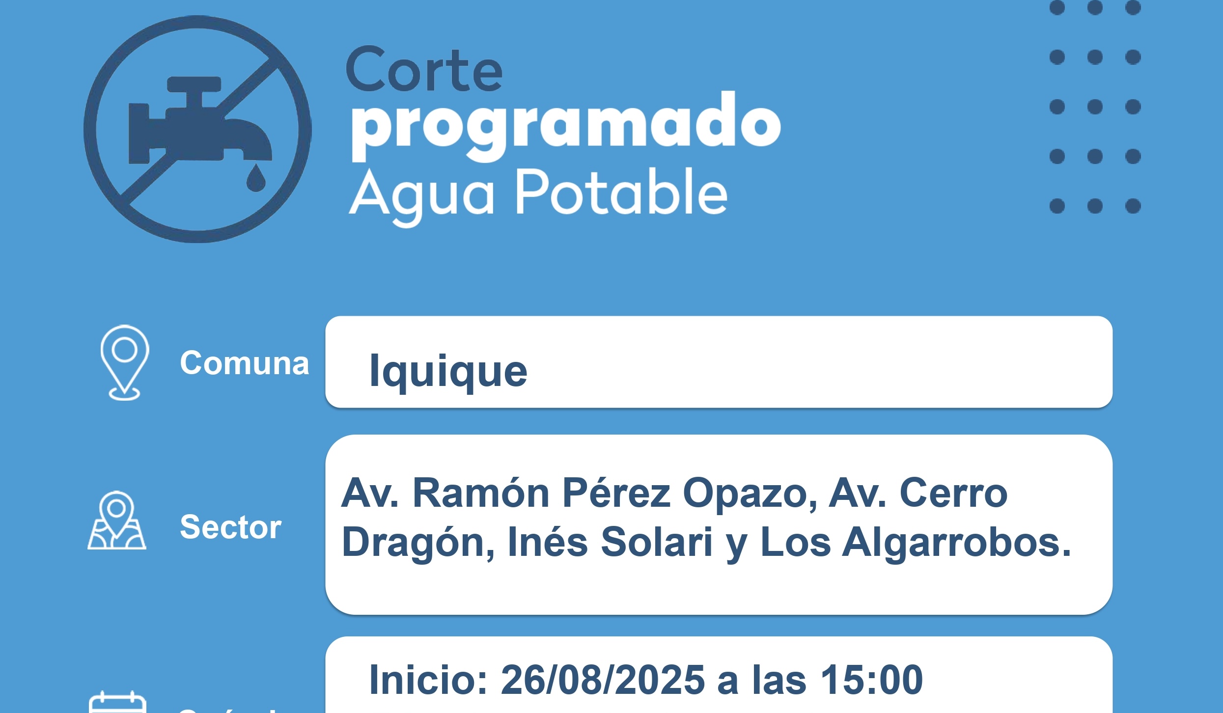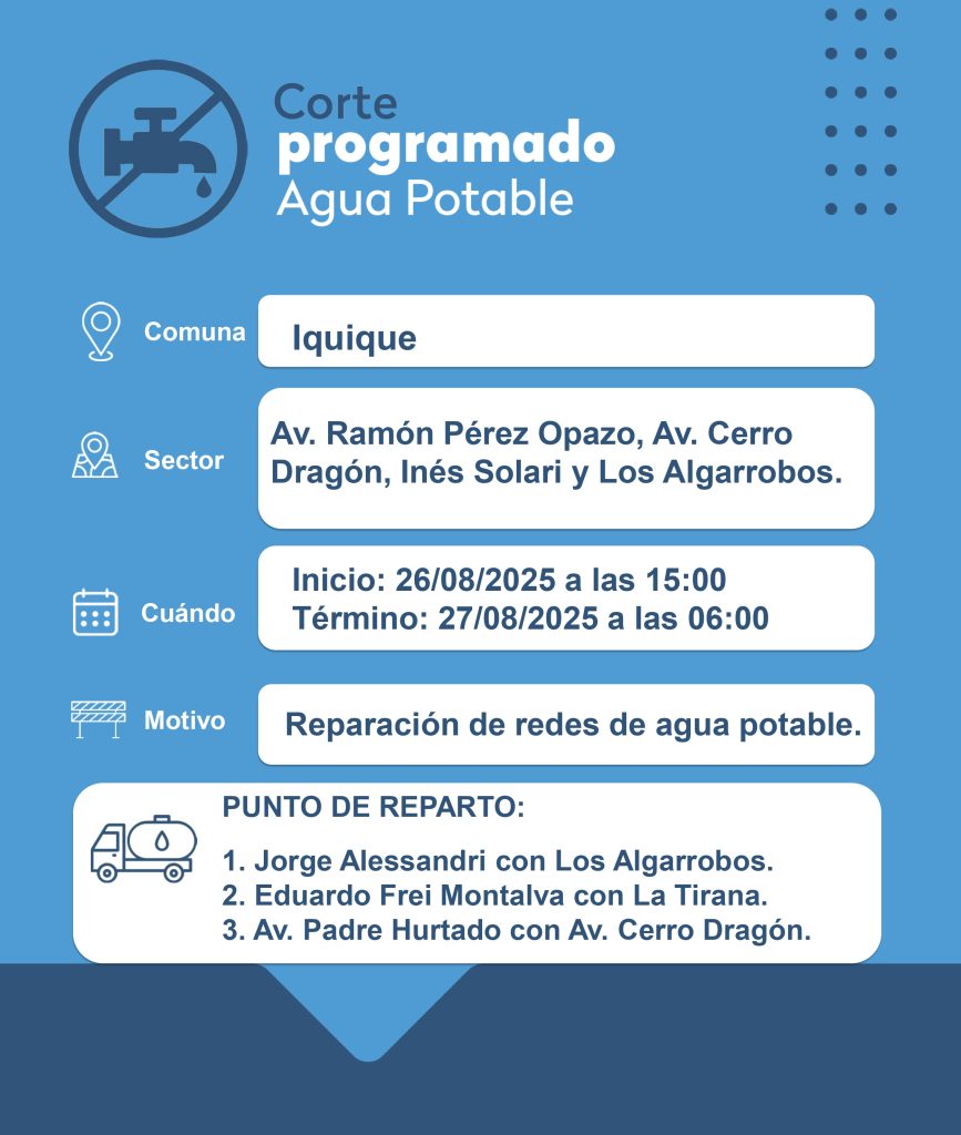 En el marco de su plan de modernización y mejora continua del servicio, Aguas del Altiplano, entre los días 26 y 28 de agosto, ejecutarán importantes trabajos de renovación de redes en distintos sectores de Iquique y Alto Hospicio. Estas labores, esenciales para asegurar la continuidad y calidad del suministro, requerirán cortes programados de agua potable en los sectores detallados a continuación: