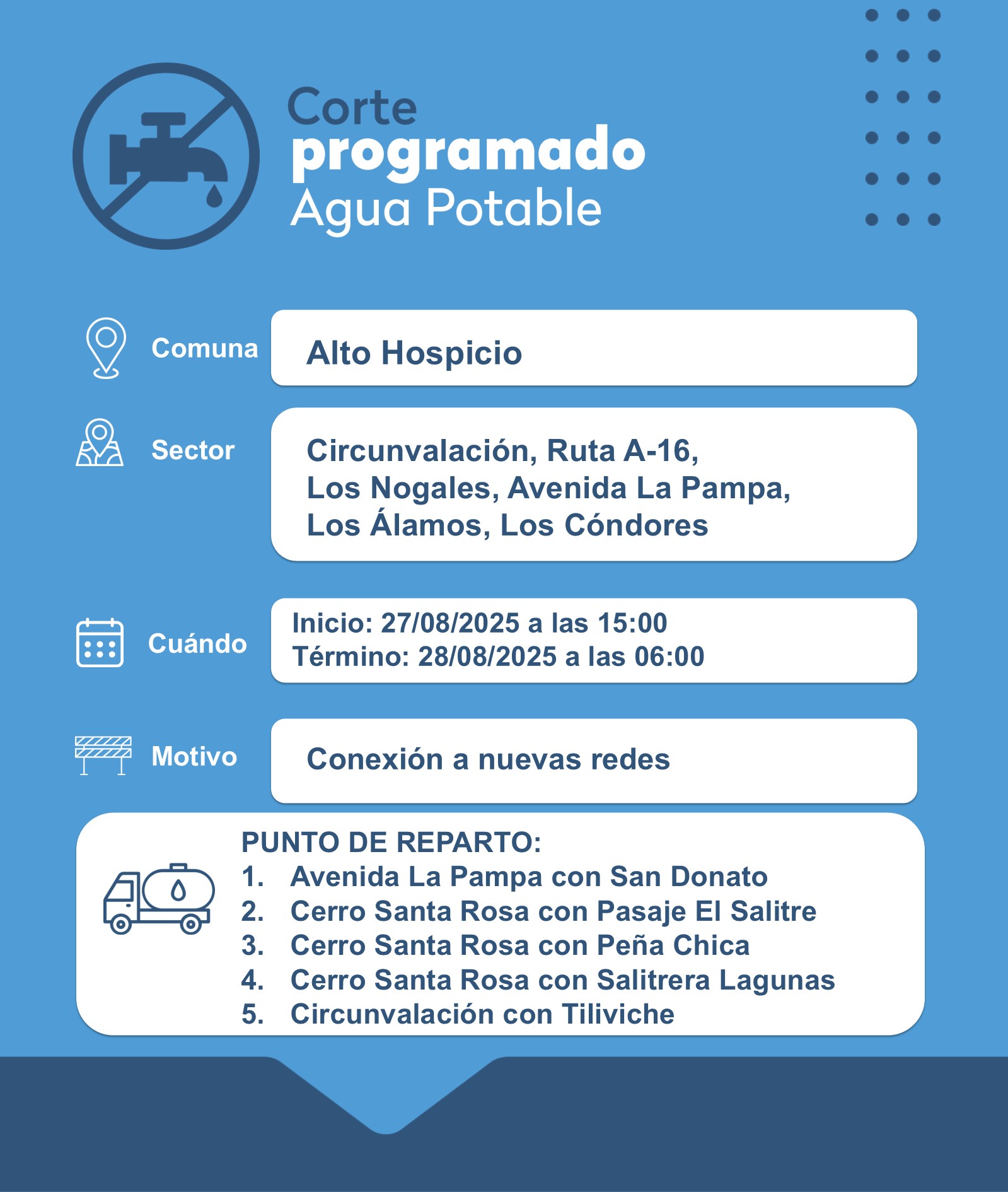 Sector involucrado: Circunvalación, Ruta A-16, Los Nogales, Av. La Pampa, Los Álamos y Los Cóndores. Puntos de distribución alternativos: estarán ubicados en Av. La Pampa con San Donato, Cerro Santa Rosa con Pasaje El Salitre, Cerro Santa Rosa con Peña Chica, Cerro Santa Rosa con Salitrera Lagunas, Circunvalación con Tiliviche.