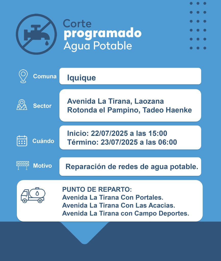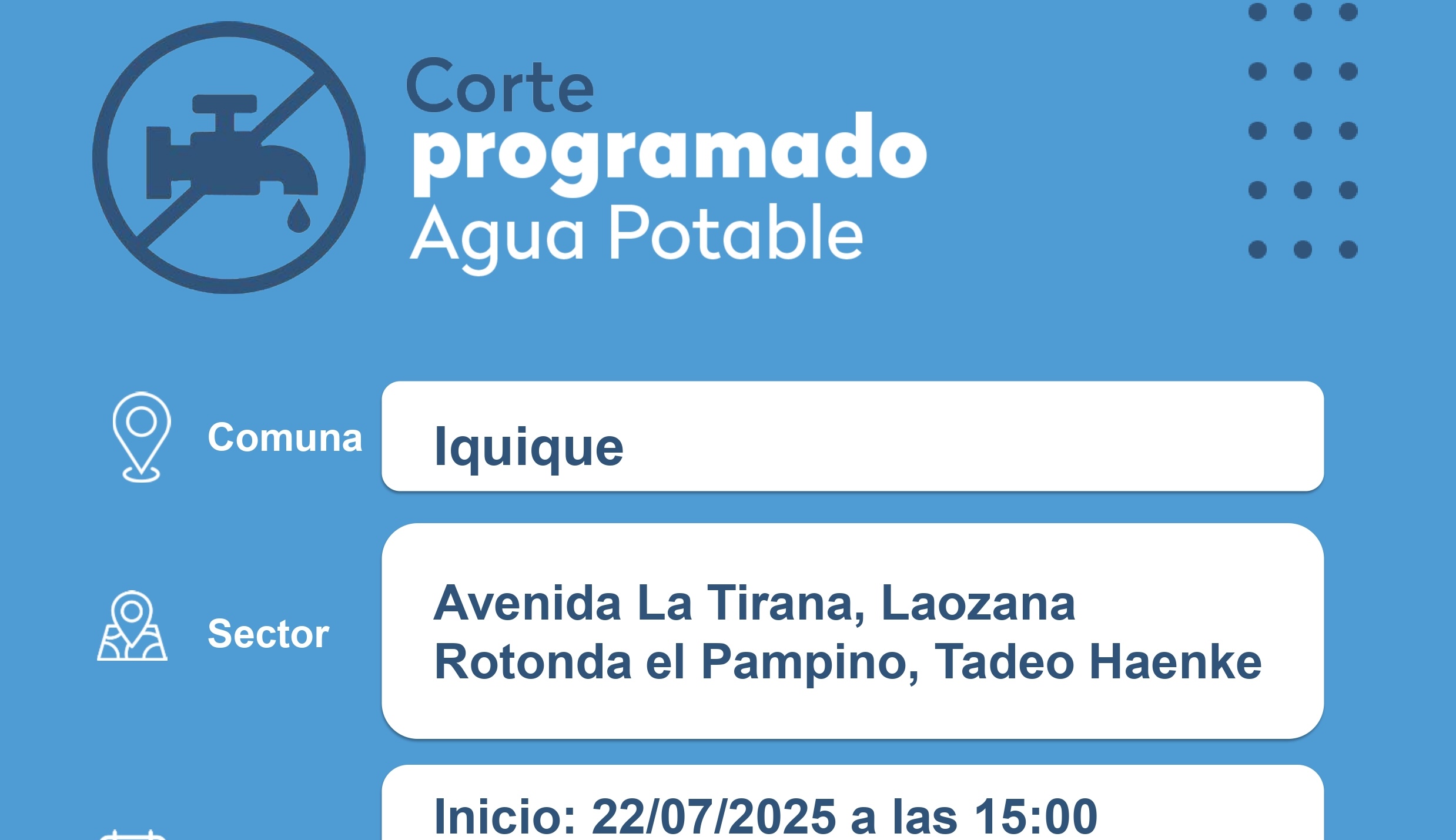La primera suspensión se realizará el lunes 22 de julio, a partir de las 15:00 horas, y se extenderá hasta las 06:00 horas del martes 23. Este operativo contempla la conexión de una nueva matriz en el sector que contempla Avenida La Tirana, Laozana, Rotonda El Pampino y Tadeo Haenke. Se dispondrá de tres puntos de distribución alternativos de agua potable, ubicados en: Av. La Tirana con Portales; Av. La Tirana con Las Acacias y en Av. La Tirana con Campo Deportes.