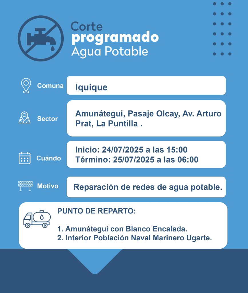 Con el objetivo de robustecer la infraestructura del sistema de agua potable en la ciudad, Aguas del Altiplano informa que se ejecutarán importantes trabajos de renovación y conexión de redes en dos sectores de Iquique, lo que requerirá cortes programados del suministro los días 22 y 24 de julio.
