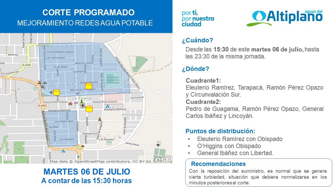 Para realizar diversos de trabajos de mejoramiento en la red de agua potable de esa localidad, específicamente mantención en las válvulas de corte; Aguas del Altiplano realizará un corte programado este martes 6 de julio en el poblado de La Tirana.