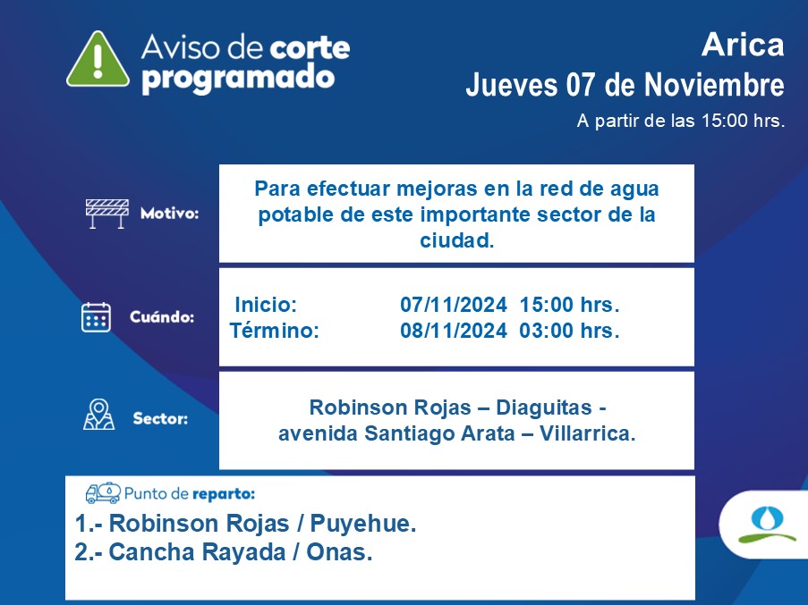 Según detalló Marcos Lastra Agurto, Jefe de la Unidad de Redes de Agua Potable de Aguas del Altiplano, las labores se ejecutarán a contar de las 15:00 horas este jueves 07 de noviembre y se extenderá hasta las 03:00 de la jornada siguiente, abarcando el cuadrante conformado por Robinson Rojas, Diaguitas, Santiago Arata y Villarrica, con un total del 719 clientes asociados a esta suspensión programada.