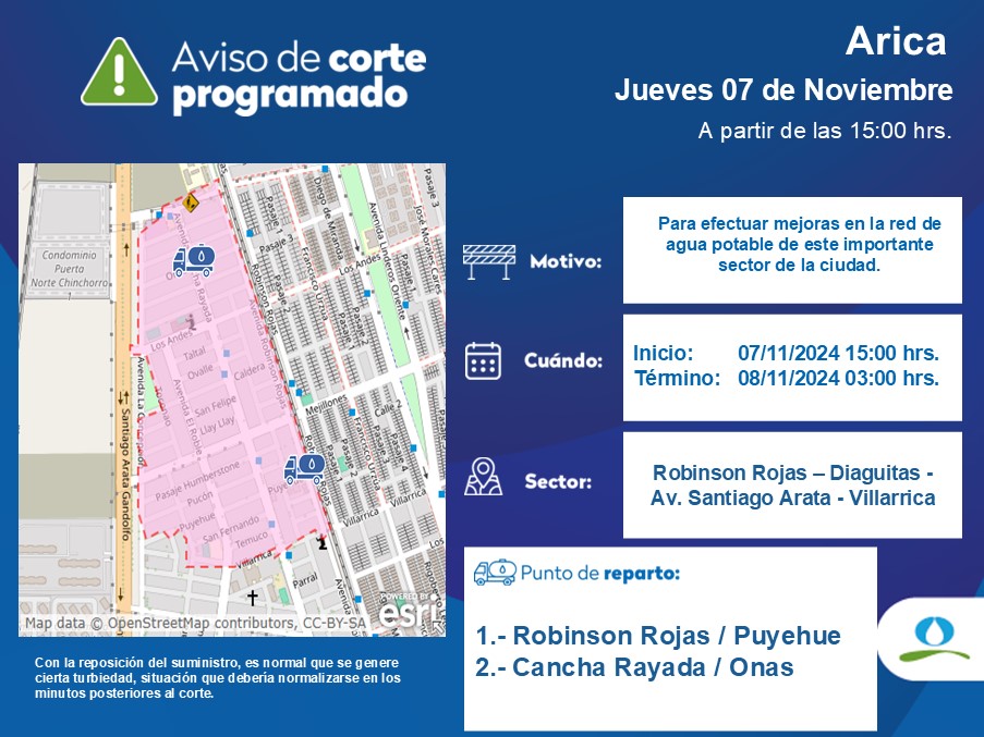 Agregó que para esta suspensión programada se dispondrá de dos puntos de distribución alternativos, los cuales estarán ubicados en Robinson Rojas con Puyehue y en Cancha Rayada con Onas. Cualquier duda o consulta, pude canalizarse a través del Call Center 600 600 9900 o a través de la página web www.aguasdelaltiplano.cl.