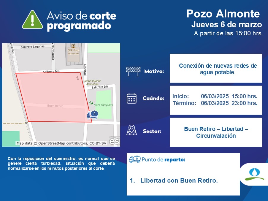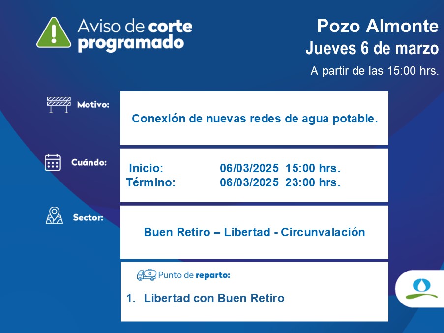 Agregó que para este corte programado se dispondrá de un punto de distribución de agua potable alternativo, el cual se ubicará en calle Buen Retiro con Libertad. Cualquier duda o consulta, puede canalizarse a través del Call Center 600 600 9900 o a través de la página web www.aguasdelaltiplano.cl.