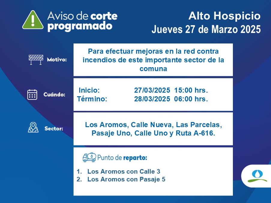 Agregó que para la jornada de este jueves, se dispondrá de dos puntos de distribución de agua potable alternativos, los cuales estarán ubicados en calle Los Aromos con Calle 3 y en Los Aromos con Pasaje 5. Cualquier duda o consulta, pude canalizarse a través del Call Center 600 600 9900 o a través de la página web www.aguasdelaltiplano.cl.