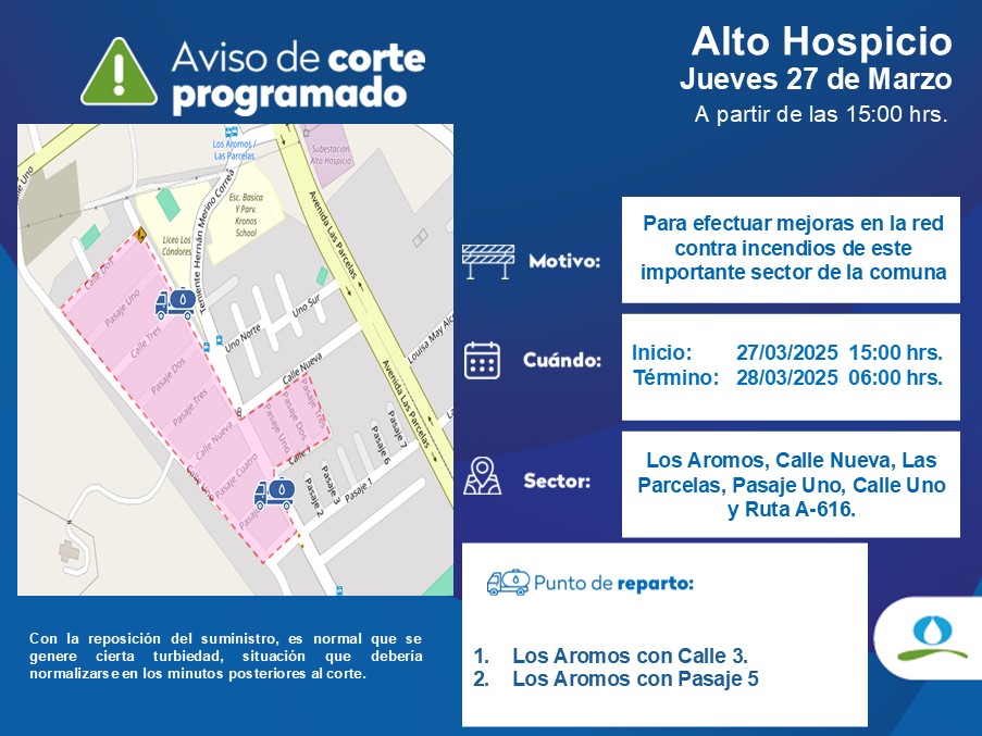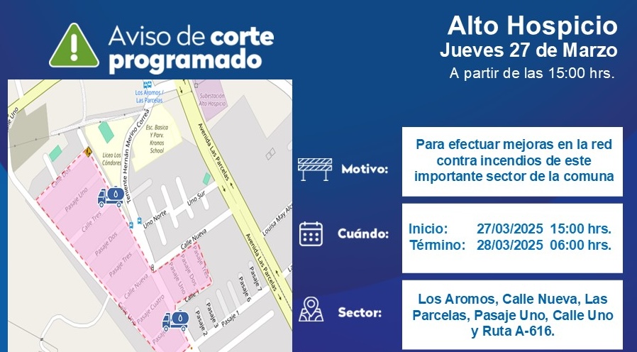 Según informó Mario Ossandón Pizarro, Jefe Zonal de Alto Hospicio y Pampa, los trabajos están programados a contar de las 15:00 horas de este jueves 27 de marzo y se entenderán hasta las 06:00 horas de la jornada siguiente, abarcando el cuadrante conformado por calle Los Aromos, Calle Nueva, avenida Las Parcelas, Pasaje Uno, Calle Uno y la ruta A-616, con un total de 763 clientes asociados a esta suspensión programada.