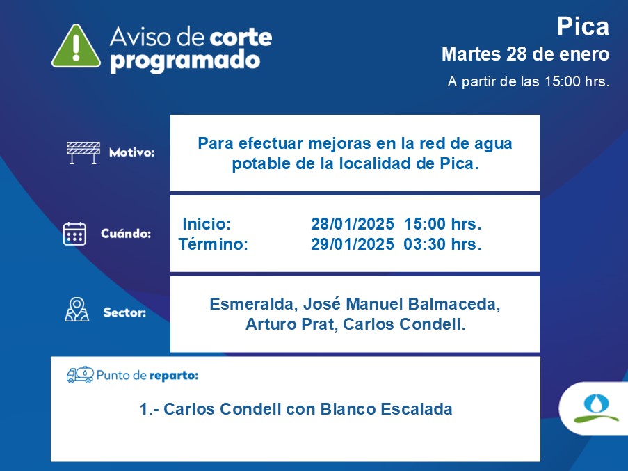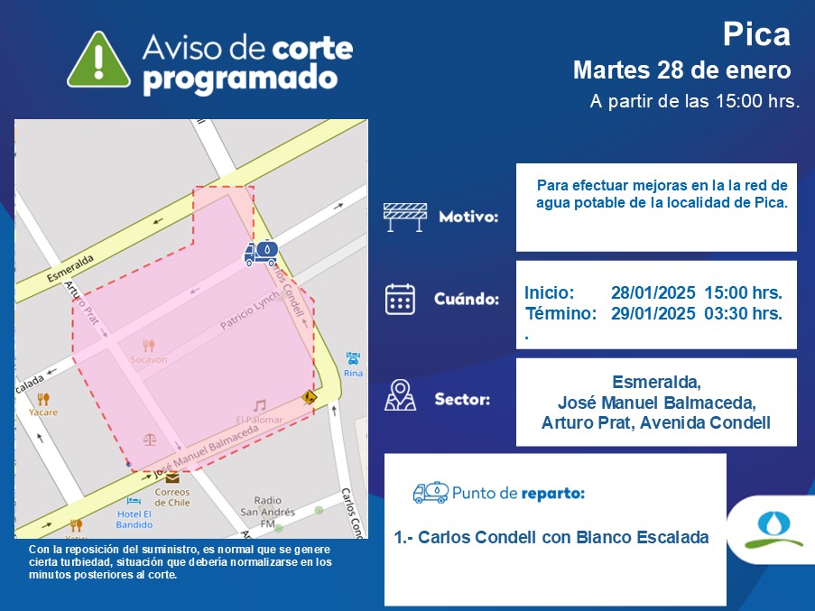 Según información entregada por el Jefe Zonal de Alto Hospicio y Pampa, Mario Ossandón Pizarro, los trabajos están programados a contar de las 15:00 horas de este martes 28 de enero y se extenderán hasta las 03:30 horas de la jornada siguiente, abarcando el sector comprendido entre las calles Esmeralda, José Manuel Balmaceda, Arturo Prat y Carlos Condell, con un total 82 clientes asociados a este corte programado.