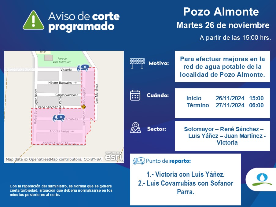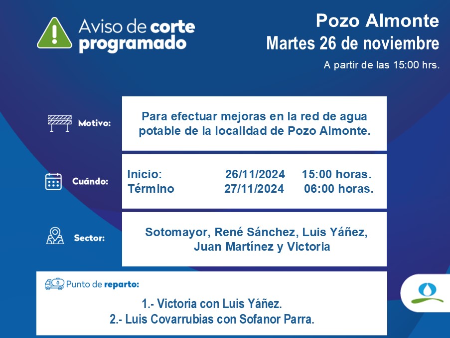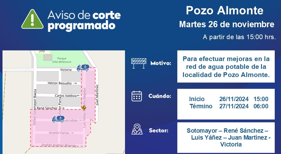 Para efectuar diversas mejoras en la red de agua potable, incluida la instalación de nuevas de válvulas de acuartelamiento y la renovación de un tramo de matriz, Aguas del Altiplano realizará este martes 26 de noviembre una suspensión programada de suministro en un sector de la localidad de Pozo Almonte.