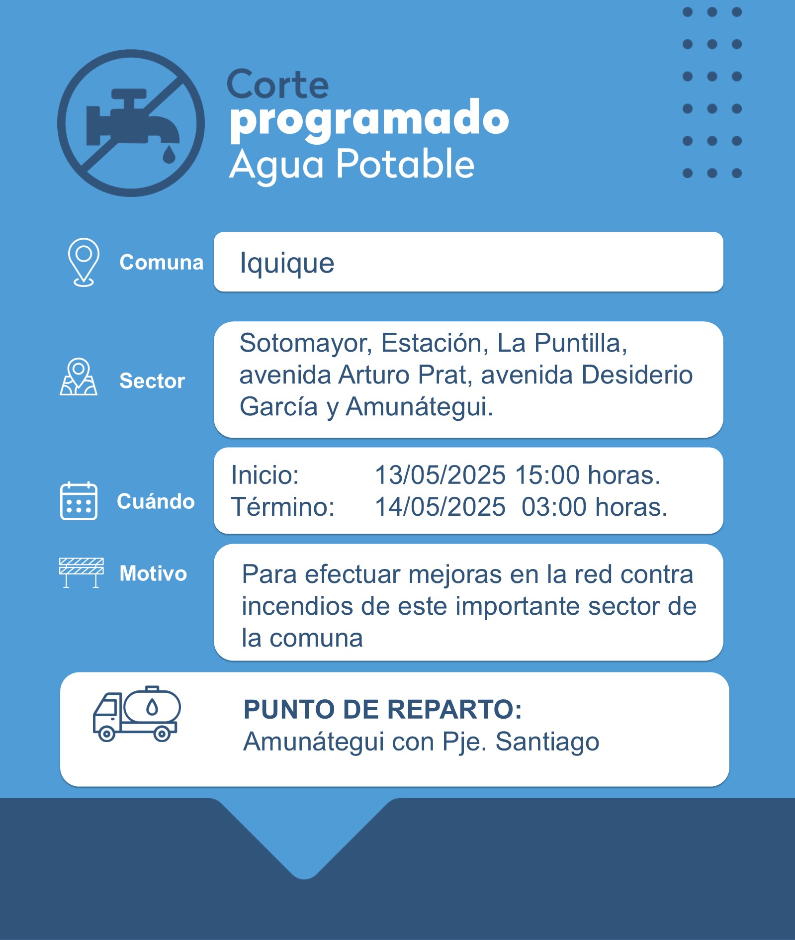 En el primer caso, el Jefe de la Unidades de Redes de Agua Potable de Iquique, Carlos Grez Etcheverry explicó que la suspensión está programada a contar de las 15:00 horas de este martes 13 de mayo y se extenderá hasta las 03:00 horas de la jornada siguiente abarcando el cuadrante conformado por las calles Sotomayor, Estación, La Puntilla, avenida Arturo Prat, avenida Desiderio García y Amunátegui, con un total de 593 clientes asociados a este corte programado.