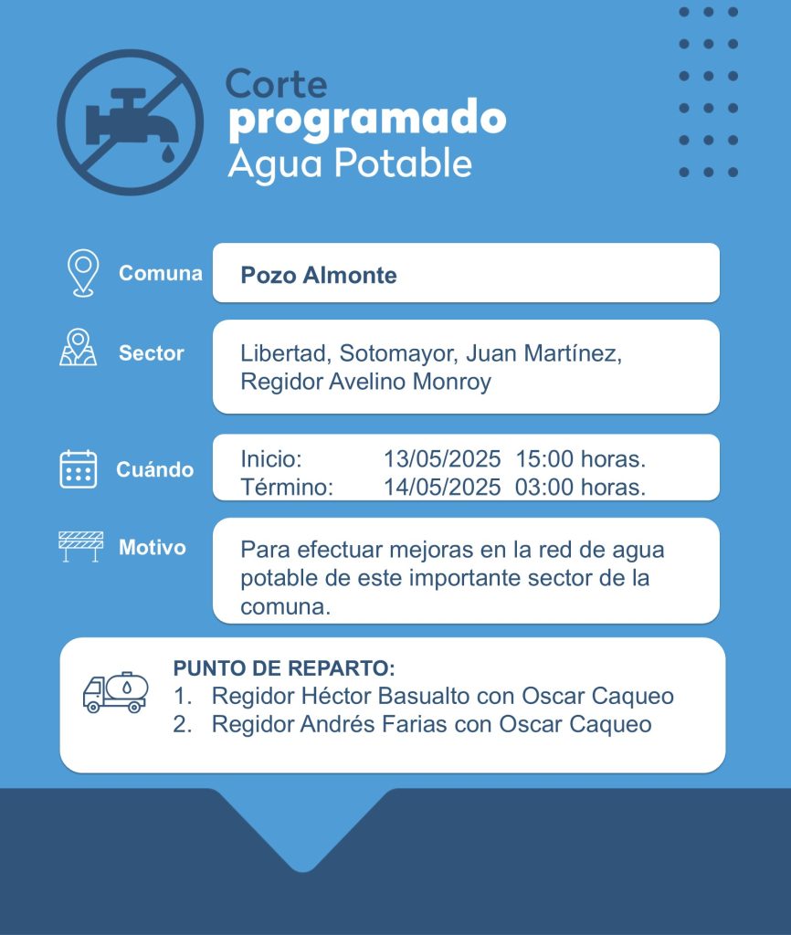 En tanto, para los trabajos a ejecutar en la comuna de Pozo Almonte, Rodrigo Sandoval De la Fuente, Jefe de la Unidad de Redes Pampa, informó que estos se ejecutarán a contar de las 15:00 horas de este martes 13 de mayo y se extenderán hasta las 03:00 horas de la jornada siguiente, abarcando el cuadrante conformado por las calles Libertad, Sotomayor, Juan Martínez y Regidor Avelino Monroy, con un total 245 clientes asociados a este corte programado.
