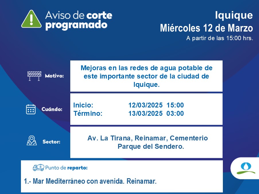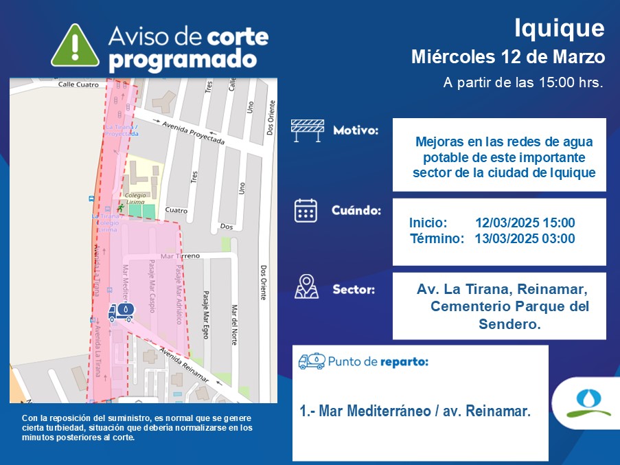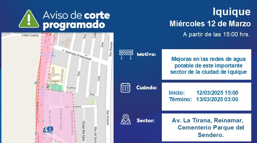 Según explicó Carlos Grez Etcheverry, Jefe de la Unidad de Redes de Agua Potable de Agua del Altiplano, la primera suspensión está programada para este miércoles 12 de marzo a contar de las 15:00 horas y se extenderán hasta las 03:00 horas de la jornada siguiente, abarcando el cuadrante conformado por avenida La Tirana, Reinamar y cementerio Parque del Sendero, con un total de 280 clientes asociados a este corte programado.