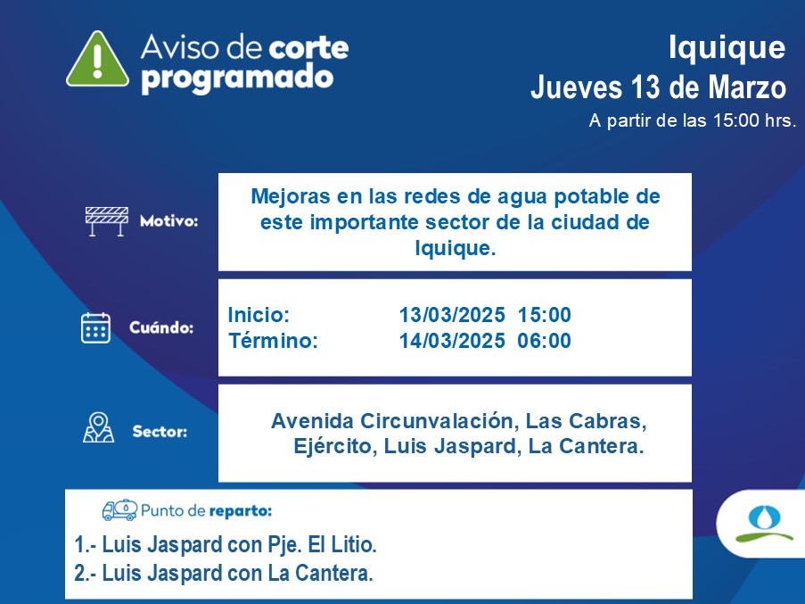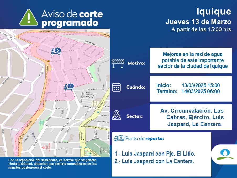 Para esta suspensión programada se habilitarán dos puntos de distribución de agua potable alternativos los cuales estarán ubicados en calle Luis Jaspard con pasaje El Litio y en calle Luis Jaspard con La Cantera.  Cualquier duda o consulta, pude canalizarse a través del Call Center 600 600 9900 o a través de la página web www.aguasdelaltiplano.cl.