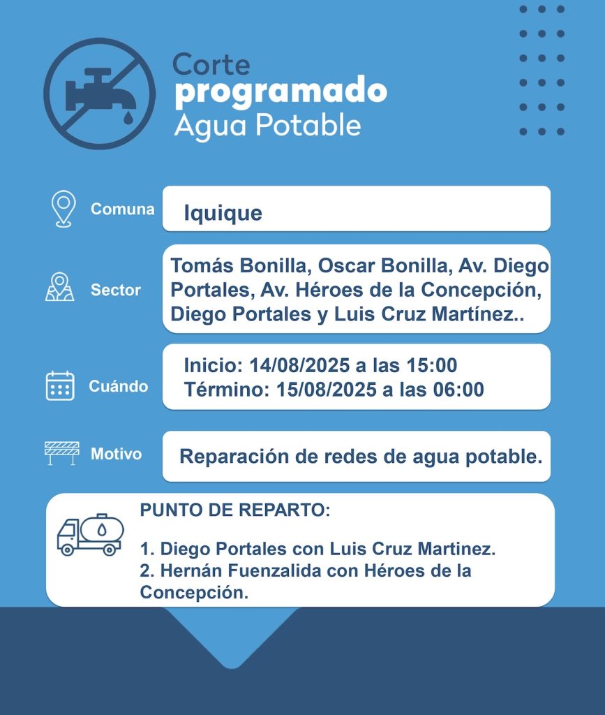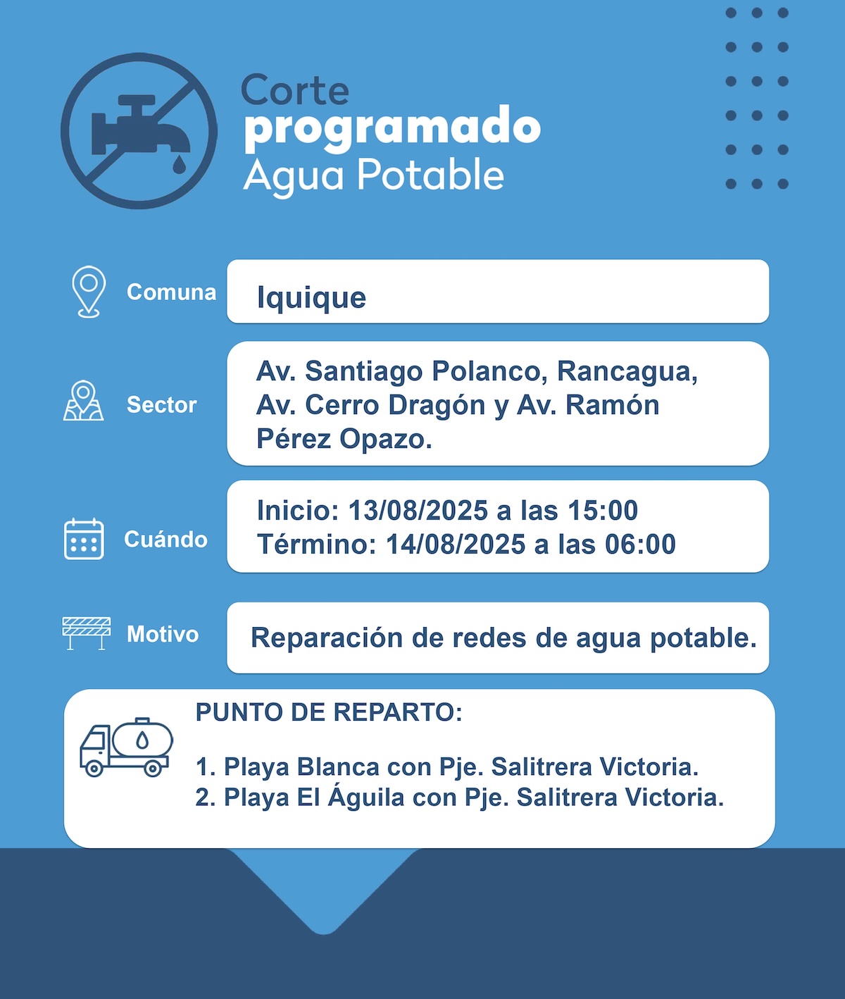 Carlos Grez Etcheverry, encargado de la Unidad de Redes de Agua Potable Iquique dijo, que durante dicho periodo, se habilitarán dos puntos de distribución de agua potable alternativos en avenida Playa Blanca con Pasaje Salitrera Victoria y en avenida Playa El Águila con Pasaje Salitrera Victoria