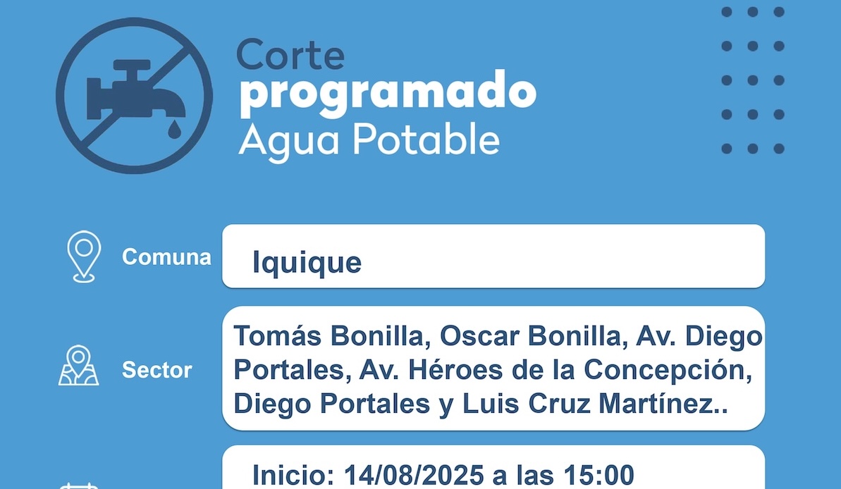Como parte de su compromiso con la mejora continua del servicio de distribución de agua potable, Aguas del Altiplano llevará a cabo trabajos de renovación de grifos y acuartelamiento en la ciudad de Iquique. Los trabajos requerirán dos cortes programados del suministro de agua potable en sectores específicos de la ciudad.