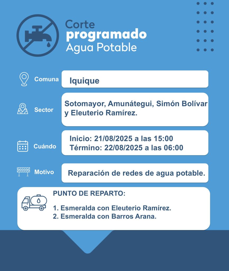 Durante la interrupción temporal del suministro, se dispondrán dos puntos de distribución de agua alternativos, ubicados en las esquinas de Esmeralda con Eleuterio Ramírez, y Esmeralda con Barros Arana