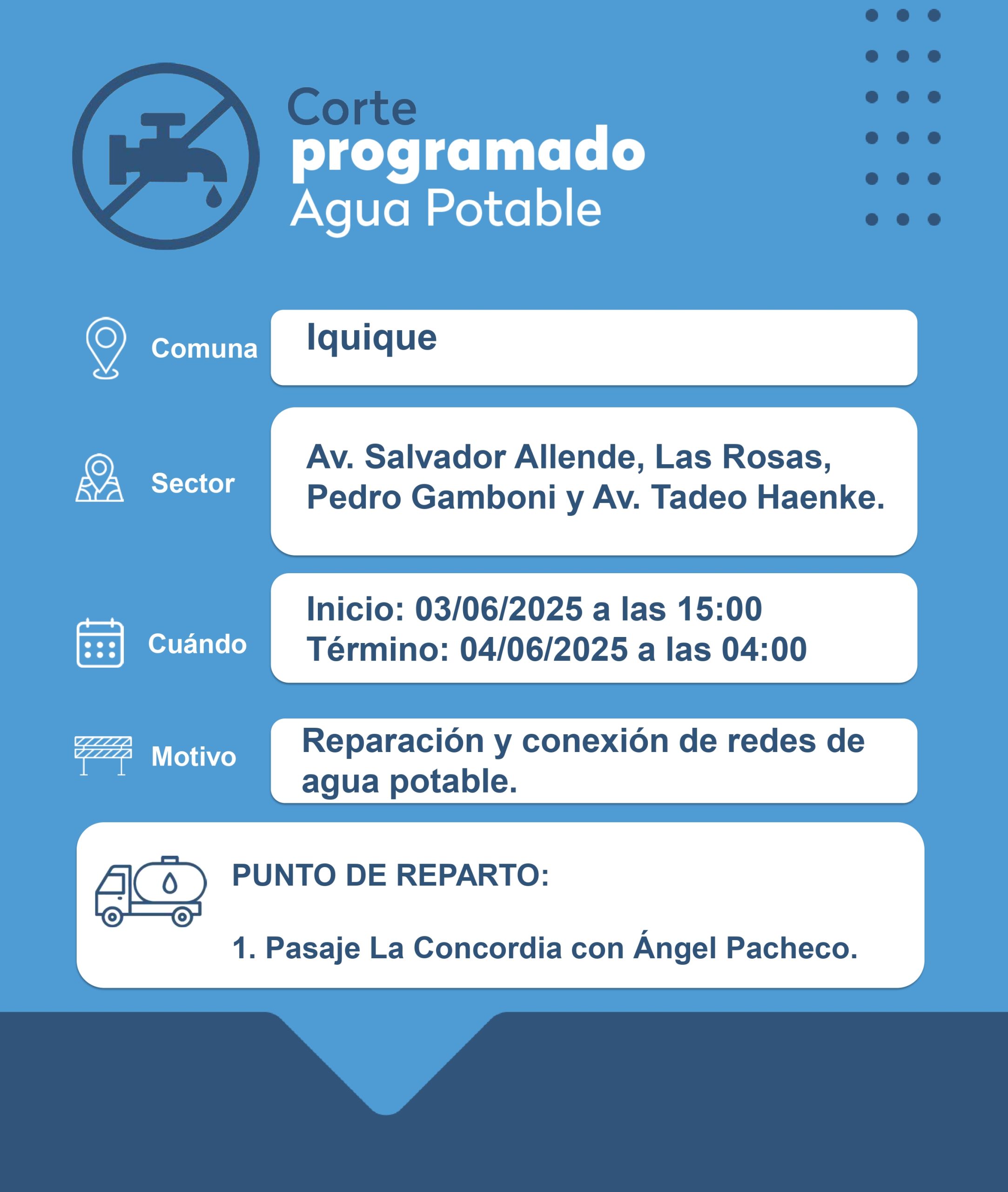 Para ejecutar estas mejoras, será necesario realizar cortes programados en el suministro de agua potable el 3 de junio en Iquique, entre las 15:00 horas y las 04:00 horas del día siguiente, en el sector que involucra el cuadrante Av. Salvador Allende, Las Rosas, Pedro Gamboni y Av. Tadeo Haenke. Se habilitará un punto de abastecimiento alternativo en Avenida La Concordia con Ángel Pacheco.