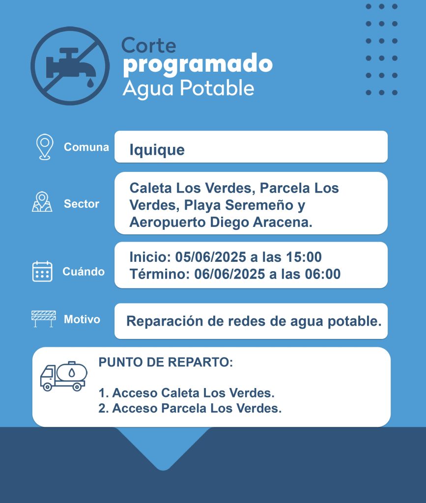 En tanto el 5 de junio, entre las 15:00 horas y hasta las 06:00 horas del 6 de junio, se ejecutarán obras de reparación de redes en el sector del borde costero que abarca el sector de Caleta Los Verdes, Parcela Los Verdes, Playa Seremeño y Aeropuerto Diego Aracena. Se habilitarán dos puntos de abastecimiento alternativo que estarán ubicados en el acceso a Caleta Los Verdes y acceso a Parcela Los Verdes.