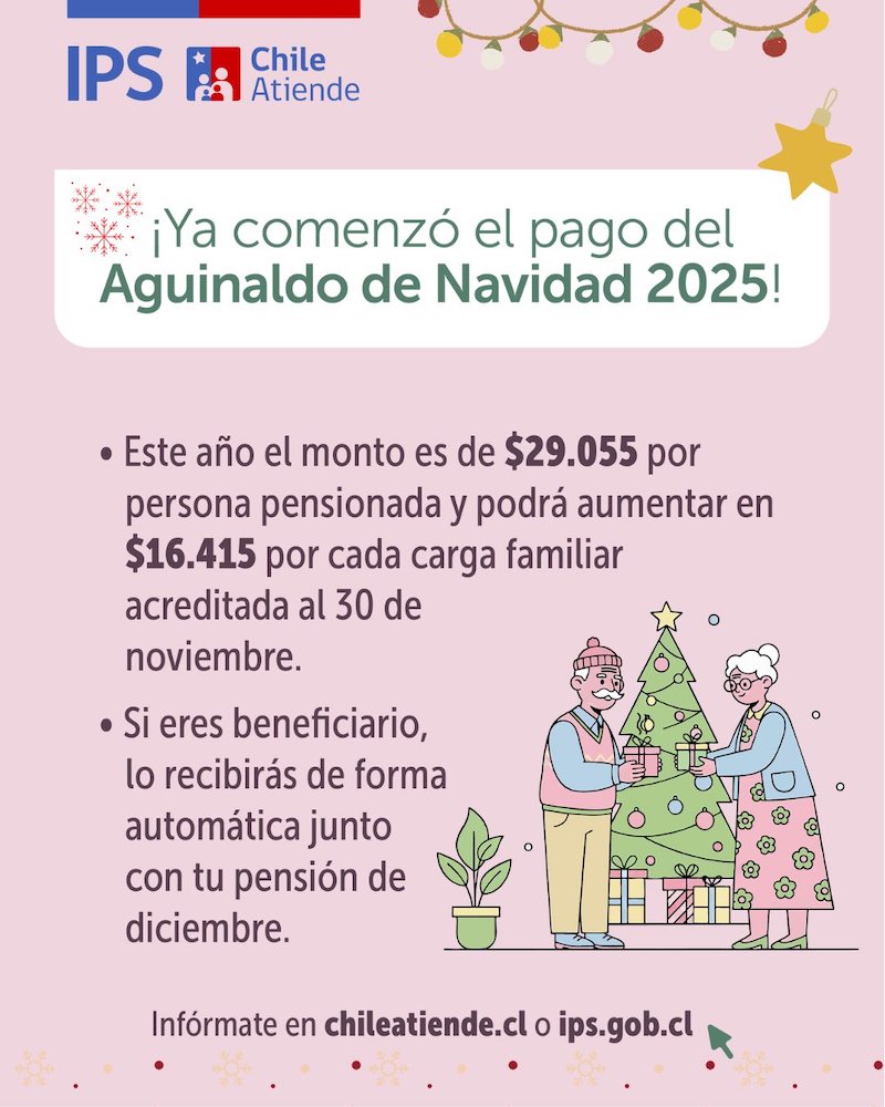 Para información general del aguinaldo, están disponibles los sitios www.ips.gob.cl, www.chileatiende.cl, Call Center 101 o 600 440 0040, redes sociales @ChileAtiende en X, Facebook e Instagram y las sucursales ChileAtiende del IPS en todo el país.