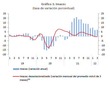 El Banco Central entregó este lunes el Índice Mensual de Actividad Económica (IMACEC)l correspondiente al mes de marzo de 2022, el que creció 7,2% en comparación con el mismo mes del año anterior.