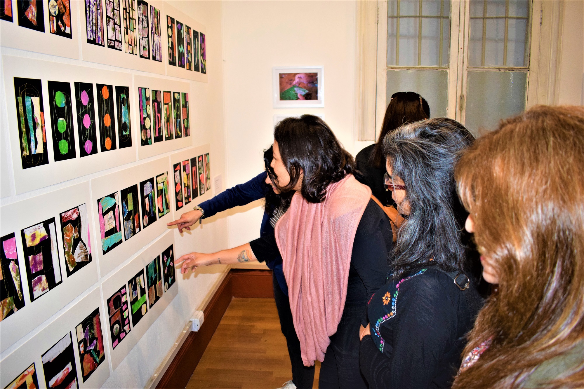 La muestra tiene una parte inicial figurativa y luego un trabajo más abstracto con variadas técnicas mixtas de acrílicos, bordados y costuras, evidenciando un proceso creativo exploratorio e intuitivo.