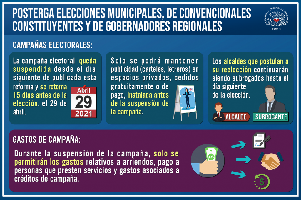 La Sala de la Cámara de Diputadas y Diputados aprobó y despachó al Senado el proyecto de reforma constitucional -presentado por el Ejecutivo- que posterga las elecciones municipales, de gobernadores regionales y de convencionales constituyentes por motivo del Covid-19 (boletín 14138).