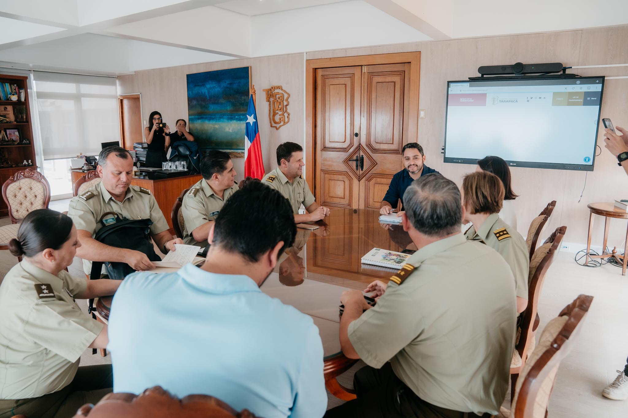 El Gobernador José Miguel Carvajal, junto a la Delegada Presidencial regional, Ivonne Donoso, recibió a los oficiales del alto mando, entre los que también se encontraba la Directora nacional de Apoyo a las Operaciones Policiales, Gral. Inspector María Teresa Araya, y el jefe de la Zona de Carabineros Tarapacá, Gral. Juan González.