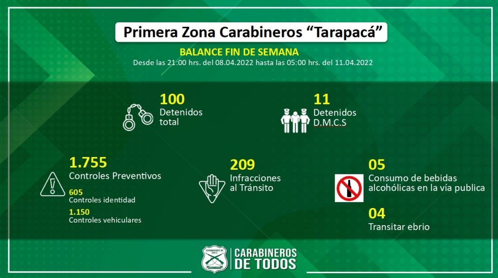 Cien personas aprehendidas por distintos delitos fue el saldo de la labor realizada por Carabineros de la Primera Zona Tarapacá en la región durante este fin de semana.