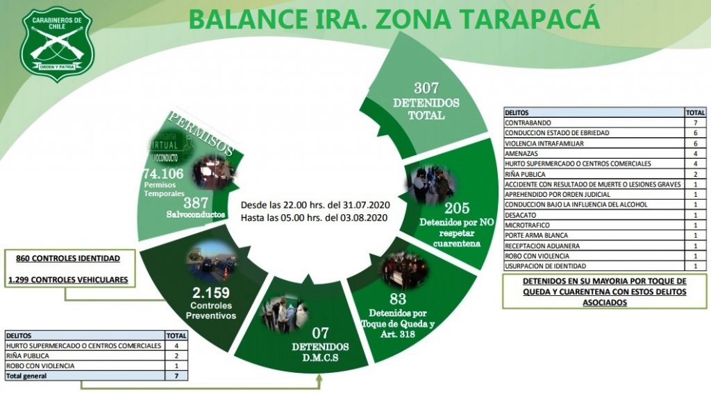 Respecto a la labor operativa realizada por la Primera Zona de Carabineros, junto a las Fuerzas Armadas y de Orden, permitieron la detención de 307 personas que fueron sorprendidas cuando cometían diferentes delitos, ya sea contra la salud pública (288), Delitos de Mayor Connotación Social (07) u otros delitos (19), como Violencia Intrafamiliar, órdenes vigentes o infracción a la ley de drogas.