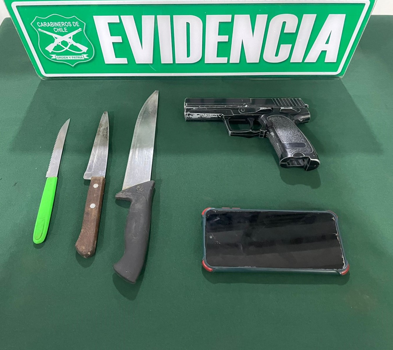 Se incautaron tres cuchillos y una pistola de juguete, la cual no presenta indicios de ser adaptada para el disparo.