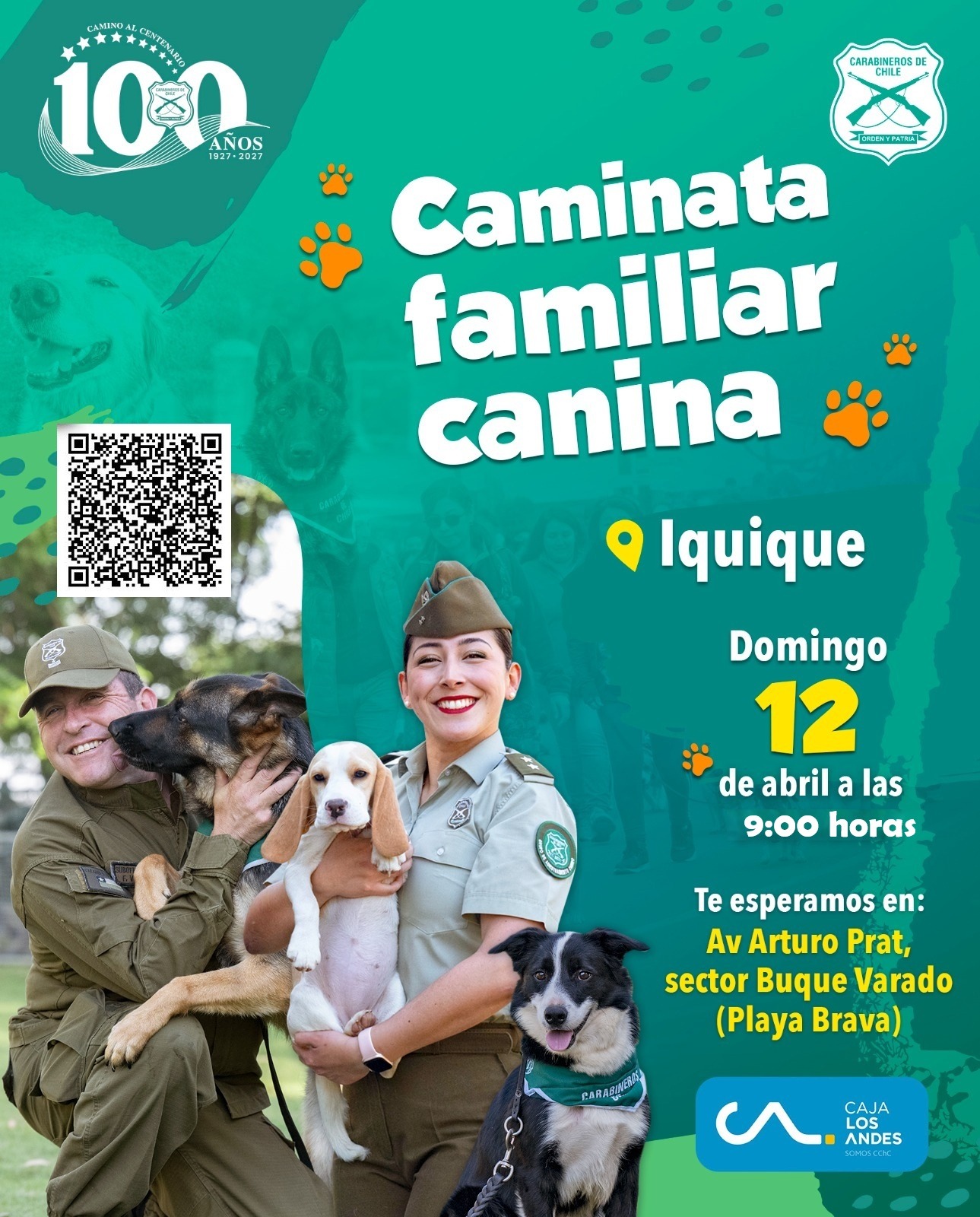 Una jornada familiar llena de sorpresas es la que prepara Carabineros de la Zona Tarapacá para este domingo 12 de abril en una nueva versión de su caminata canina, la que comenzará en el sector de Buque Varado y es abierta a la comunidad.