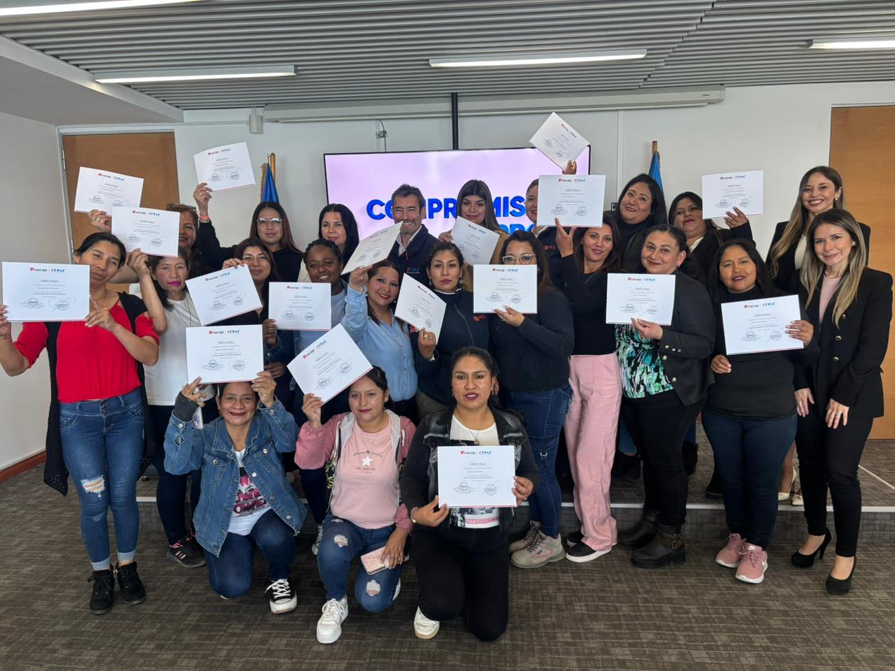 Durante la ceremonia de cierre participaron Jorge Rueda Vaché, vicepresidente gremial; Tania Etcheverry Palma, presidenta de la Comisión de Mujeres; Paula Tejeda Águila, gerenta regional de la CChC Tarapacá; Jenniffer Calderón Naranjo, representante de EBCO; Jocelyn Castro Bastías, representante de ACL; y las 19 trabajadoras que culminaron el curso.