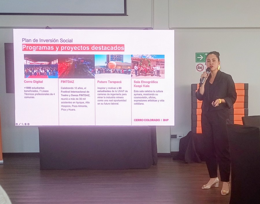 La exposición principal estuvo a cargo de Lorena Ramírez, Vicepresidenta de Asuntos Corporativos, Comunidades y Comunicaciones de Pampa Norte/BHP, quien detalló el proceso de reapertura del yacimiento ubicado en Pozo Almonte. Durante su intervención, Ramírez subrayó el impacto histórico del mineral en términos de empleo, innovación tecnológica y progreso social para las familias tarapaqueñas.