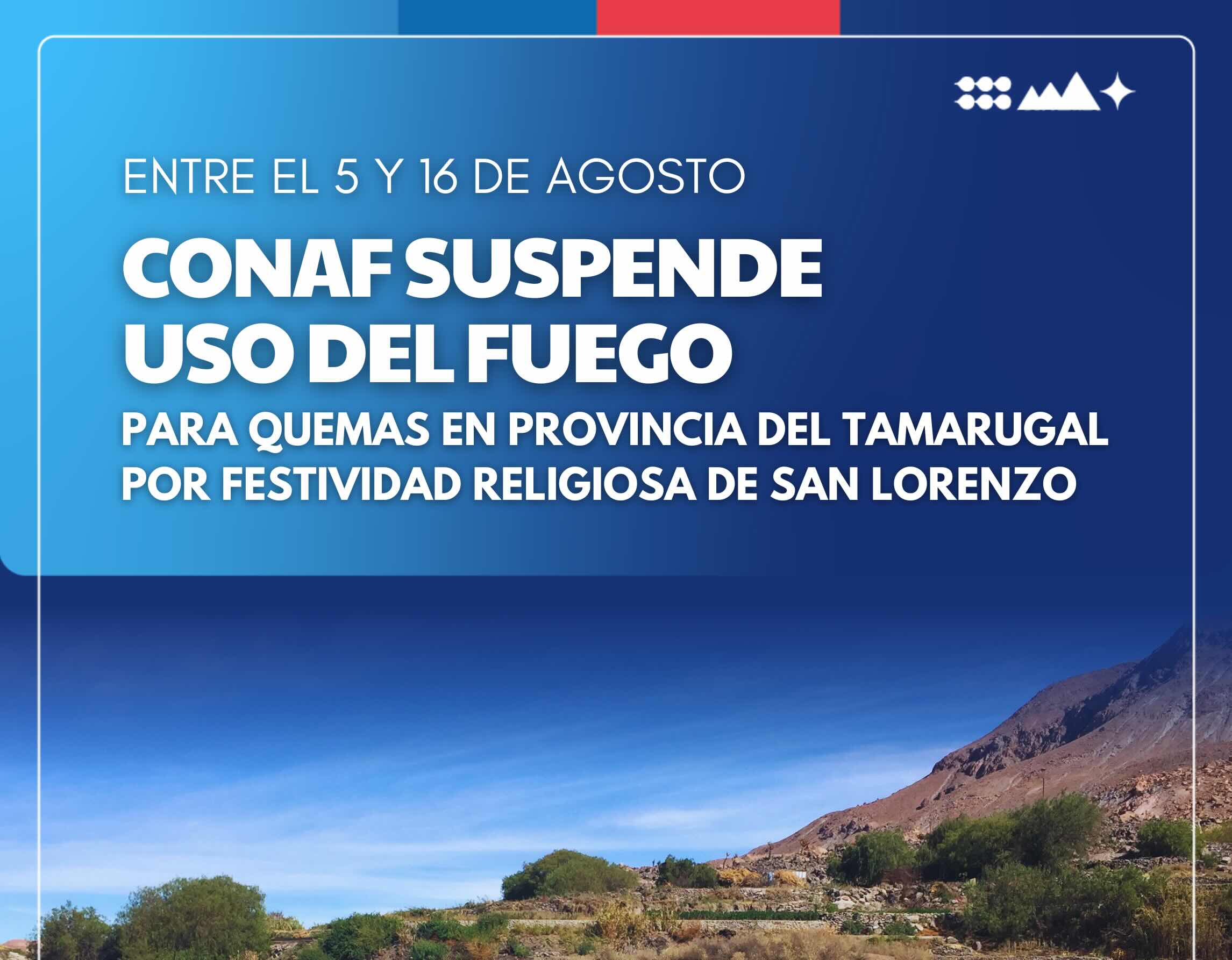 Ante la proximidad de la Fiesta Religiosa de San Lorenzo, la Corporación Nacional Forestal estableció la suspensión total de quemas desde este lunes 5 al viernes 16 de agosto para la provincia del Tamarugal.