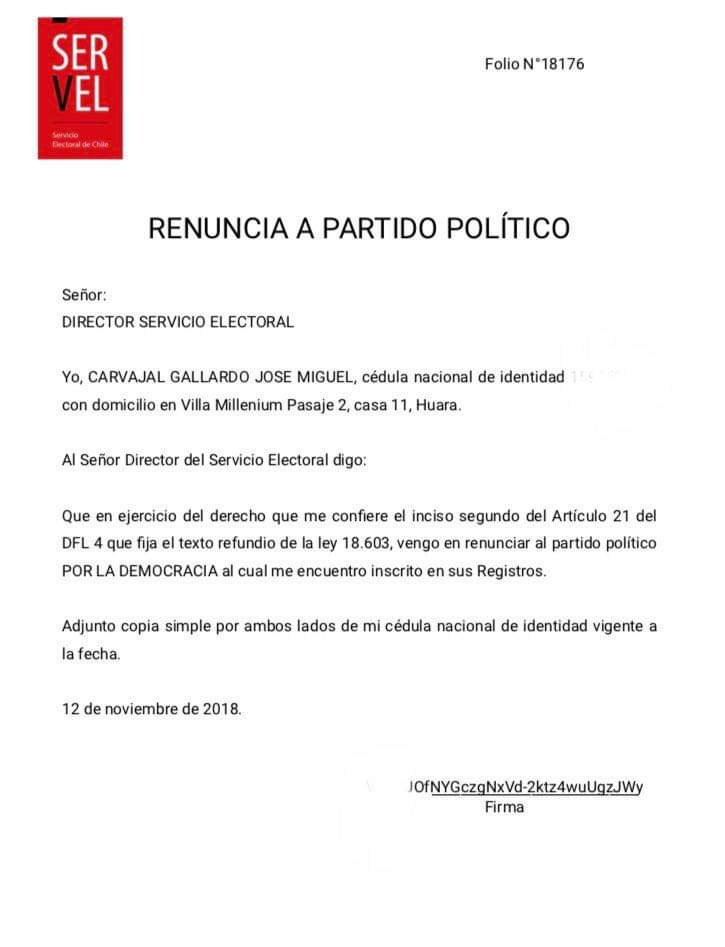 Junto con dar a conocer su carta de alejamiento del PPD, también entregó una copia de su renuncia, con fecha 12 de noviembre del año en curso, presentada en el SERVEL.