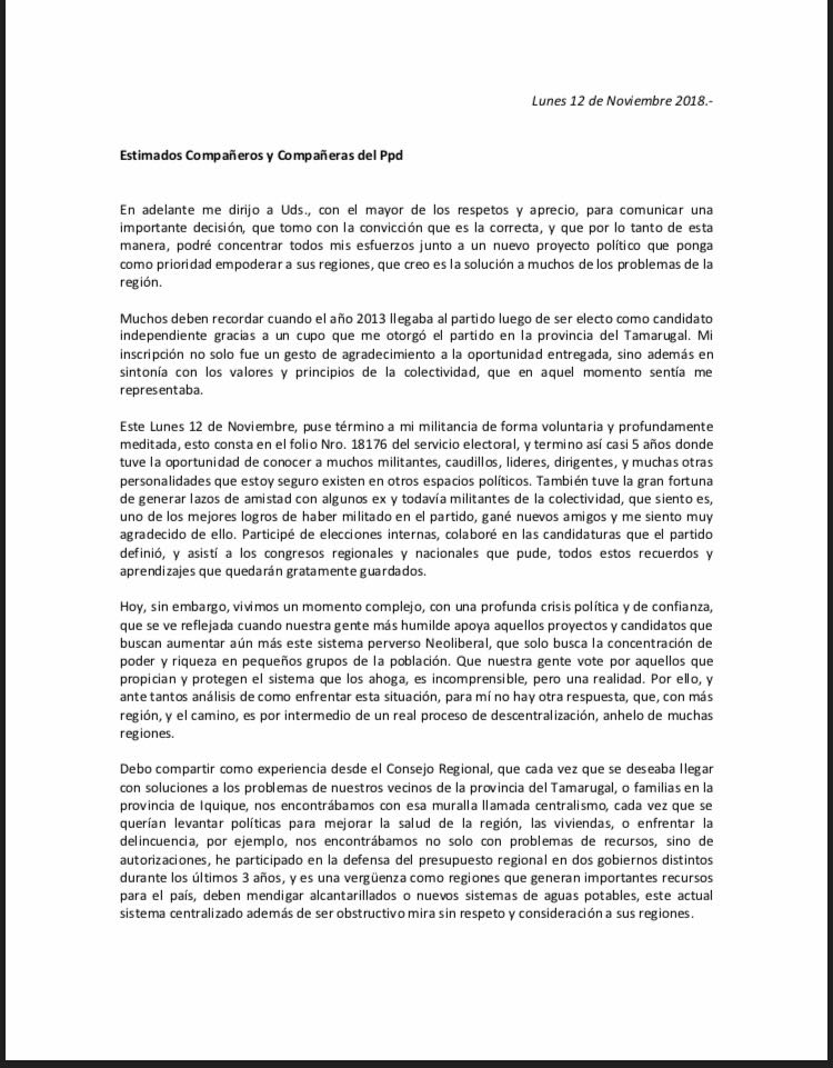En su carta argumenta su decisión señalando que prefiere seguir su carrera en forma independiente, cansado de las trabas que coloca sostenidamente el denominado «centralismo». El ahora exPPD, en todo caso, manifestó su decisión ‘con todo respeto y aprecio’. También expresa que seguirá trabajando ‘desde el regionalismo’ para lograr la descentralización.