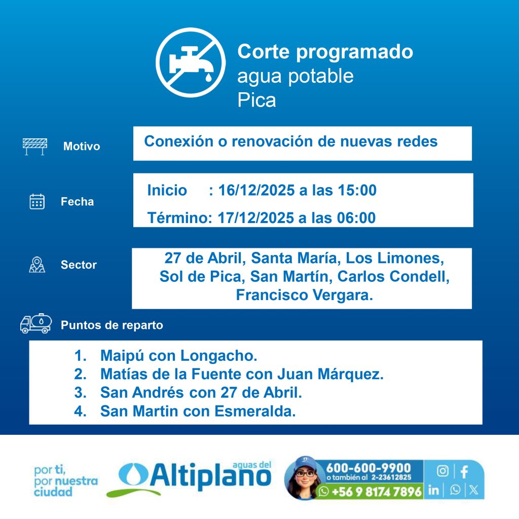 Con el objetivo de fortalecer el servicio en la comuna Aguas del Altiplano realizará un corte programado de agua potable en la comuna de Pica.