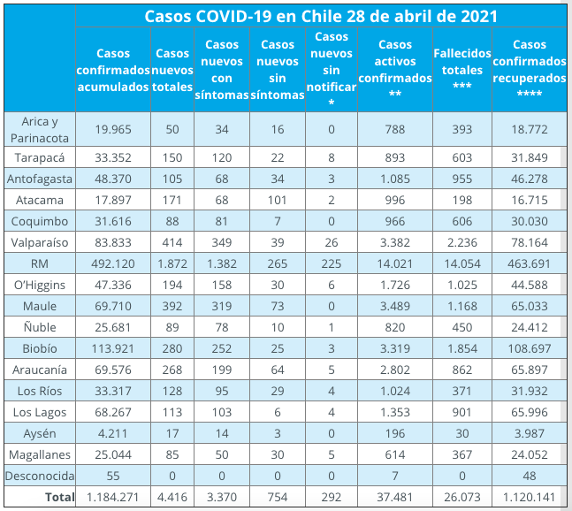 En tanto, la región de Magallanes registra el índice de incidencia más alto a nivel país por 100 mil habitantes. Mientras que las regiones con mayor aumento de nuevos casos confirmados en los últimos siete días son: Aysén, Arica, Magallanes y Atacama.