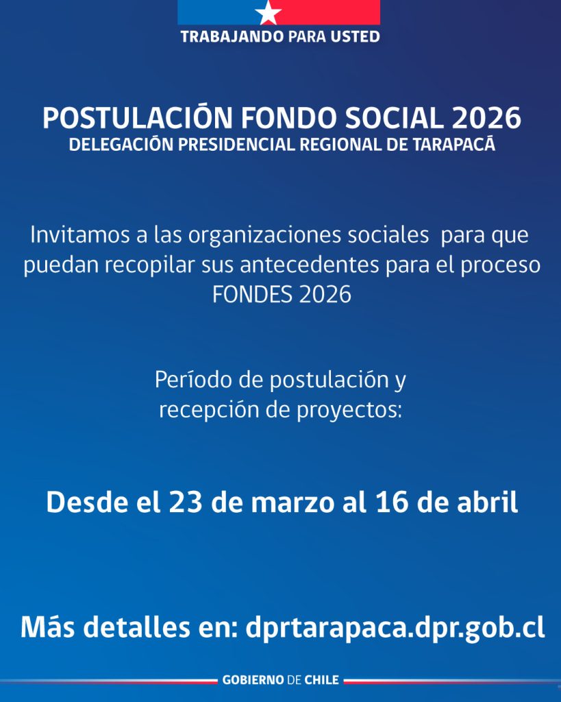 Para este año, la postulación de proyectos de equipamiento comunitario, implementación comunitaria e infraestructura que postulen a los fondos desconcentrados, se efectuará exclusivamente a través del Departamento de Acción Social de la Delegación Presidencial Regional de Tarapacá, en horario de 09:00 a 12:00 horas, dado que el plazo final es el jueves 16 de abril de 2026.