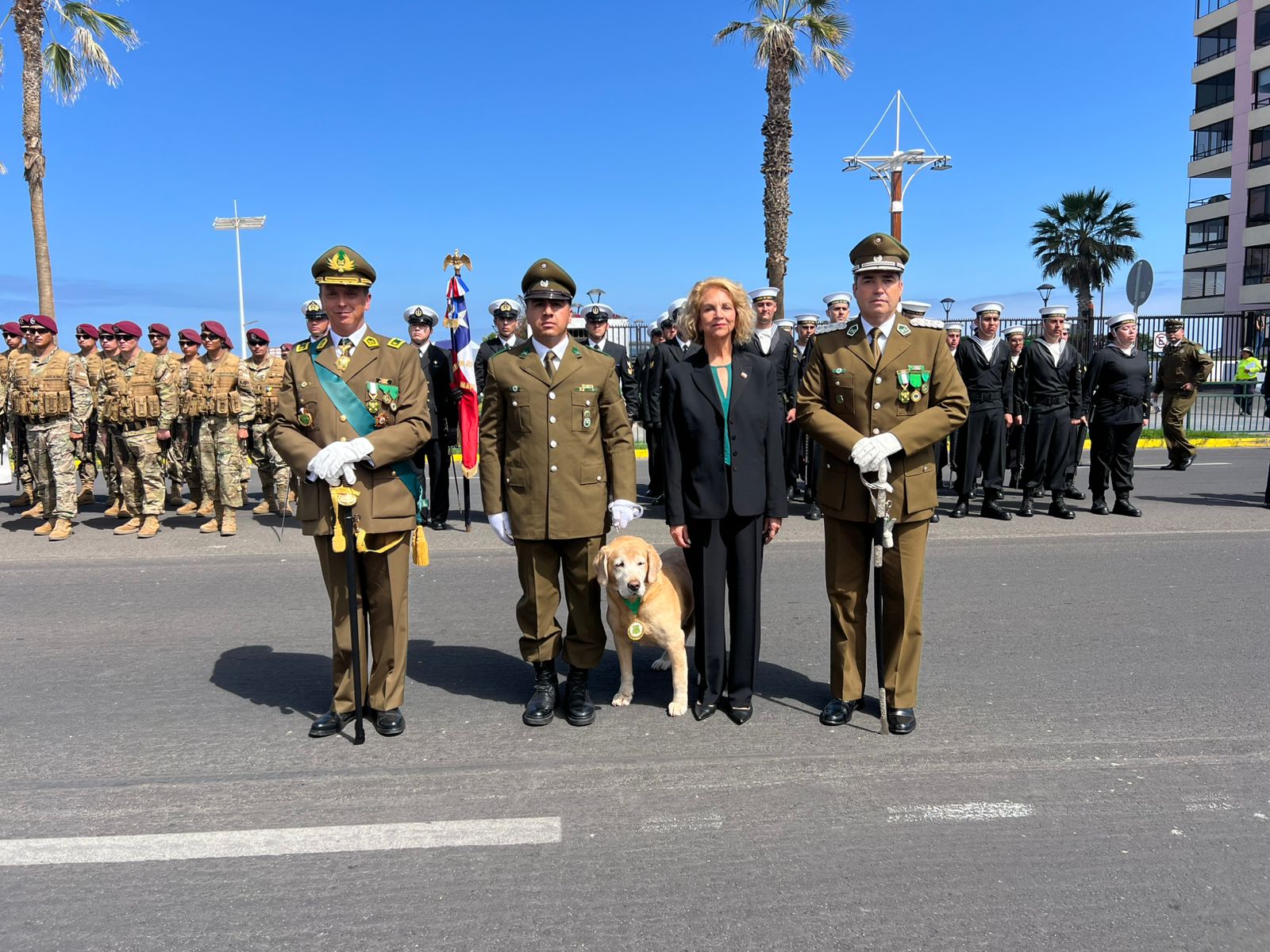 Delegada Presidencial regional de Tarapacá, Adriana Tapia Cifuentes, acompañó al jefe de zona Tarapacá, general Adrián Andrades, en la ceremonia cívico militar, que se realizó en la Plaza O’Higgins, con motivo del nonagésimo noveno aniversario de Carabineros de Chile y que por primera vez contó con la activa participación de Gendarmería de Chile.