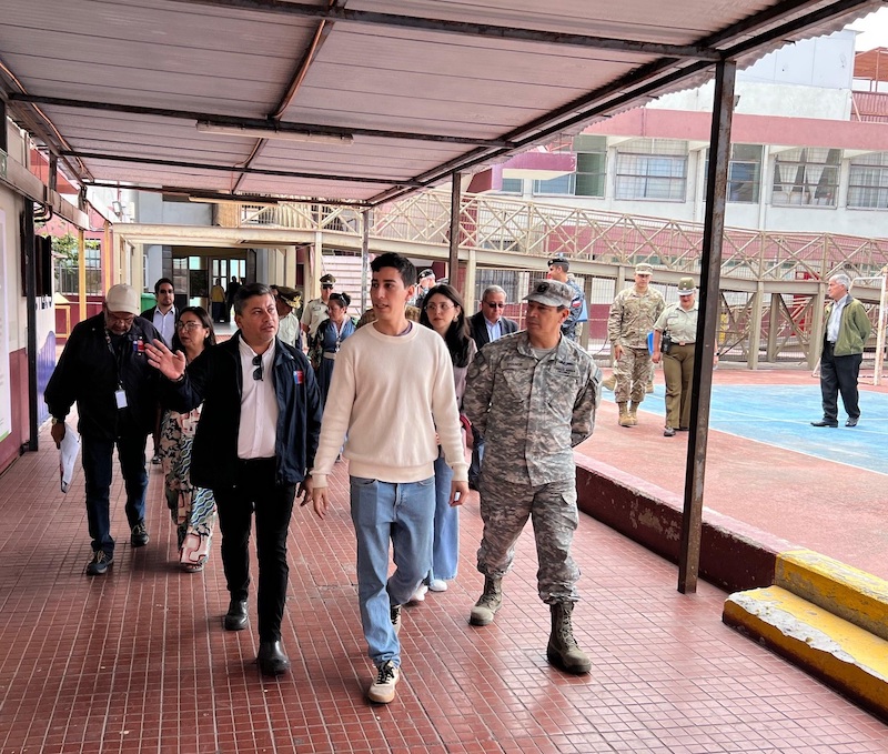 En la visita al Liceo Bernardo O’Higgins participaron el delegado presidencial regional de Tarapacá, Pedro Medalla; director del Servel, Luis Arangua; jefe de Fuerza Regional, general de Aviación Miguel Stange; jefe Primera Zona Tarapacá de Carabineros, general Adrián Andrades; jefe IV Zona Naval, contralmirante Marcelo Zoppi; seremi de Gobierno, Rodrigo Vargas; seremi de Educación, Carolina Vargas; seremi de Justicia, Pablo Valenzuela; seremi de Seguridad Pública, Ana María Peralta; y seremi del Mop, Juan Papic.