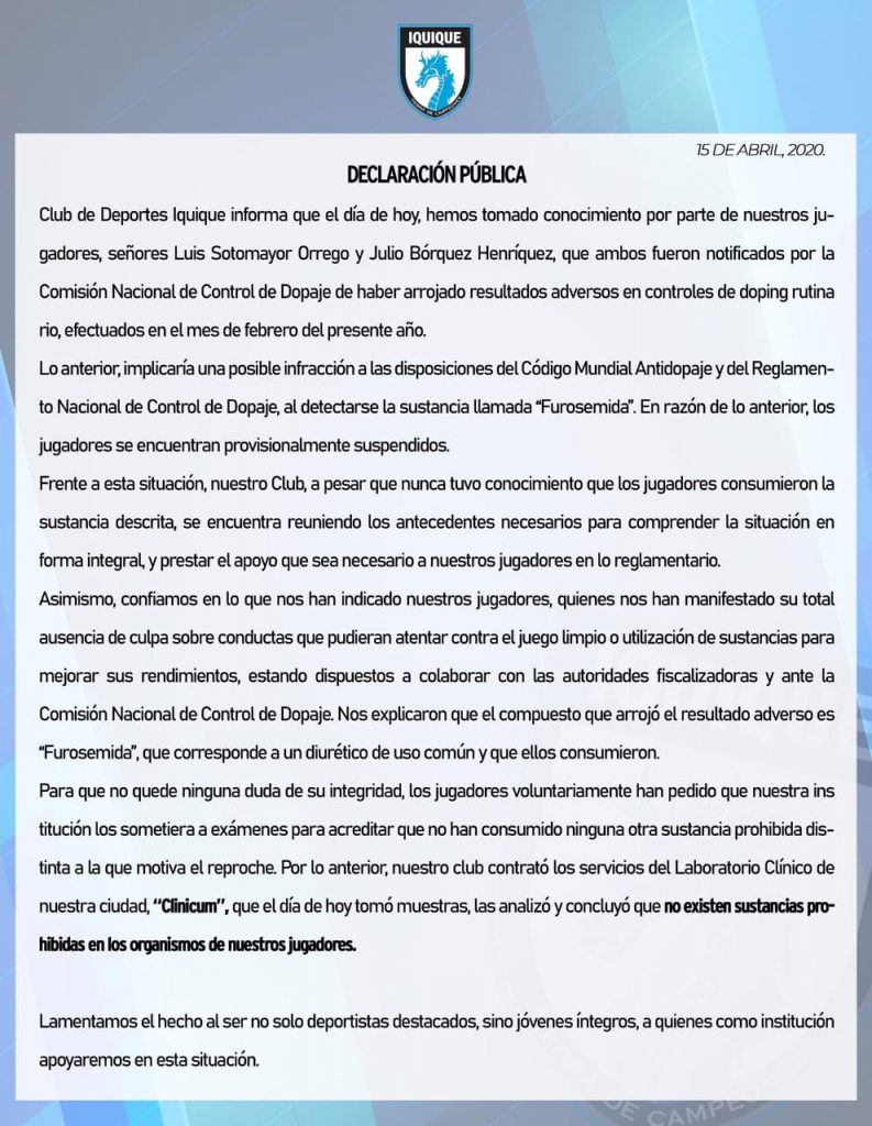 El directorio del Club de Deportes Iquique emitió una declaración pública respecto a una notificación de la Comisión Nacional de Control de Dopaje.