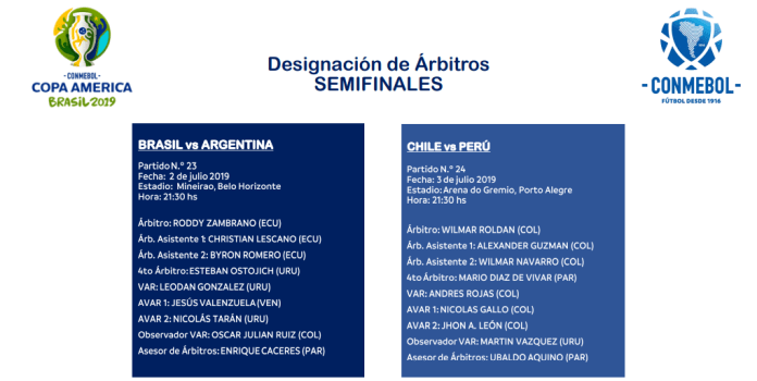 La Comisión de Árbitros de la CONMEBOL dio a conocer la nómina de árbitros para los juegos de Semifinal de la CONMEBOL Copa América Brasil 2019: