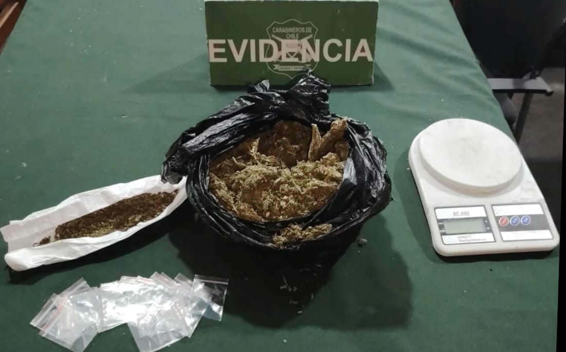 Debido a lo anterior se detuvo al infractor, de 30 años, por el delito de receptación. Continuando con el procedimiento, los uniformados inspeccionaron el interior del vehículo, encontrando debajo del asiento una bolsa que contenía marihuana, una pesa digital y envases de plástico.