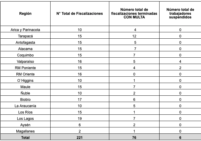 En el programa inspectivo anterior, los pasados días 30 y 31 de octubre, con ocasión del feriado de Iglesias Evangélicas y Protestantes, la DT realizó 225 fiscalizaciones, con 67 multas por $212.366.490 y 6 tripulantes suspendidos.